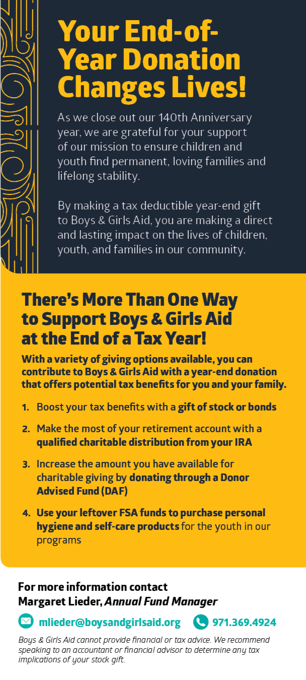 I’d like to invite you to join me in celebrating Boys & Girls Aid’s legacy, and investing in its future, with a year-end gift. We’ve included information here to help you maximize both the charitable impact and year-end tax benefits of your contribution.